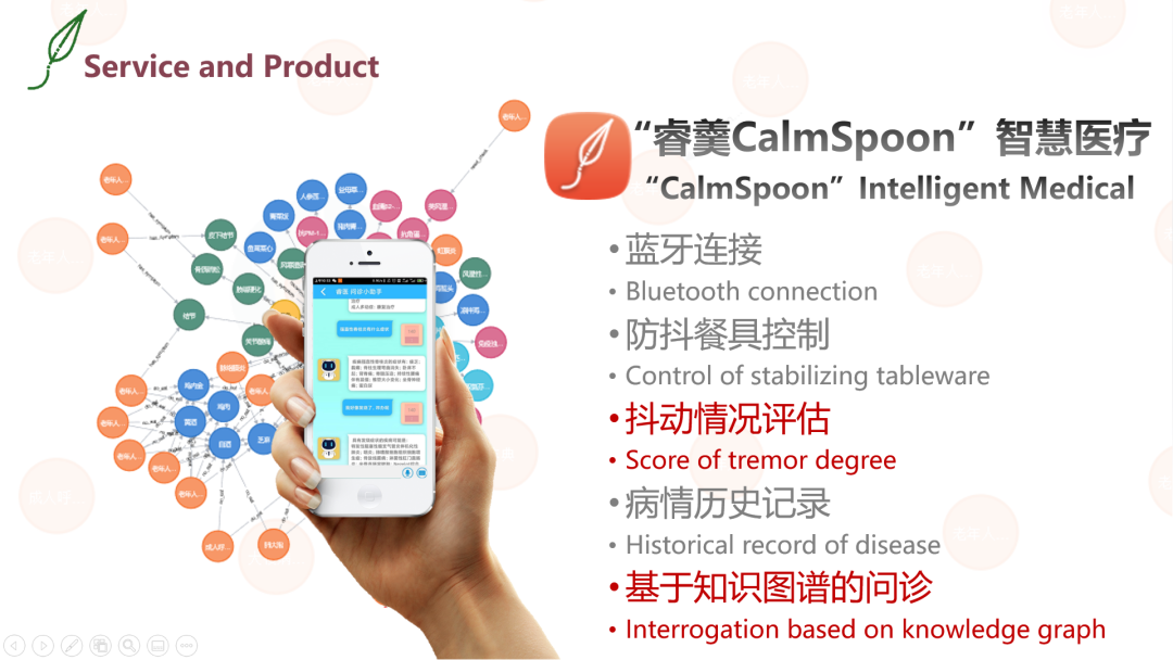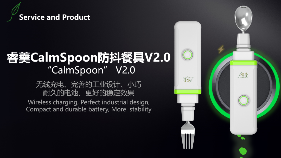 团队关注到帕金森病等震颤患者因肢体震颤不能自主进食,通过调研,设计了一款帮助他们进食自理,提升生活质量的防抖餐具。同时团队应用大数据分析、知识图谱等技术,开发了APP提供智慧医疗服务。