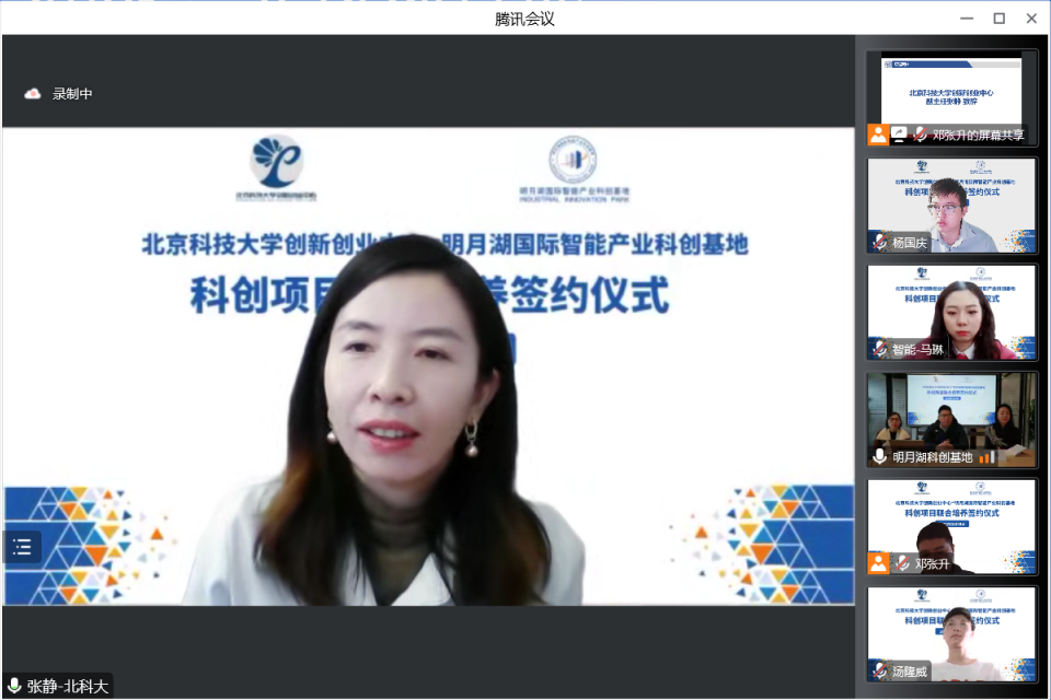 接下来张静致辞。张静首先表示了对重庆明月湖智能科技发展有限公司能够积极支持杏吧 科创项目的感谢。接下来她从三方面介绍北科大的杏吧 相关工作。