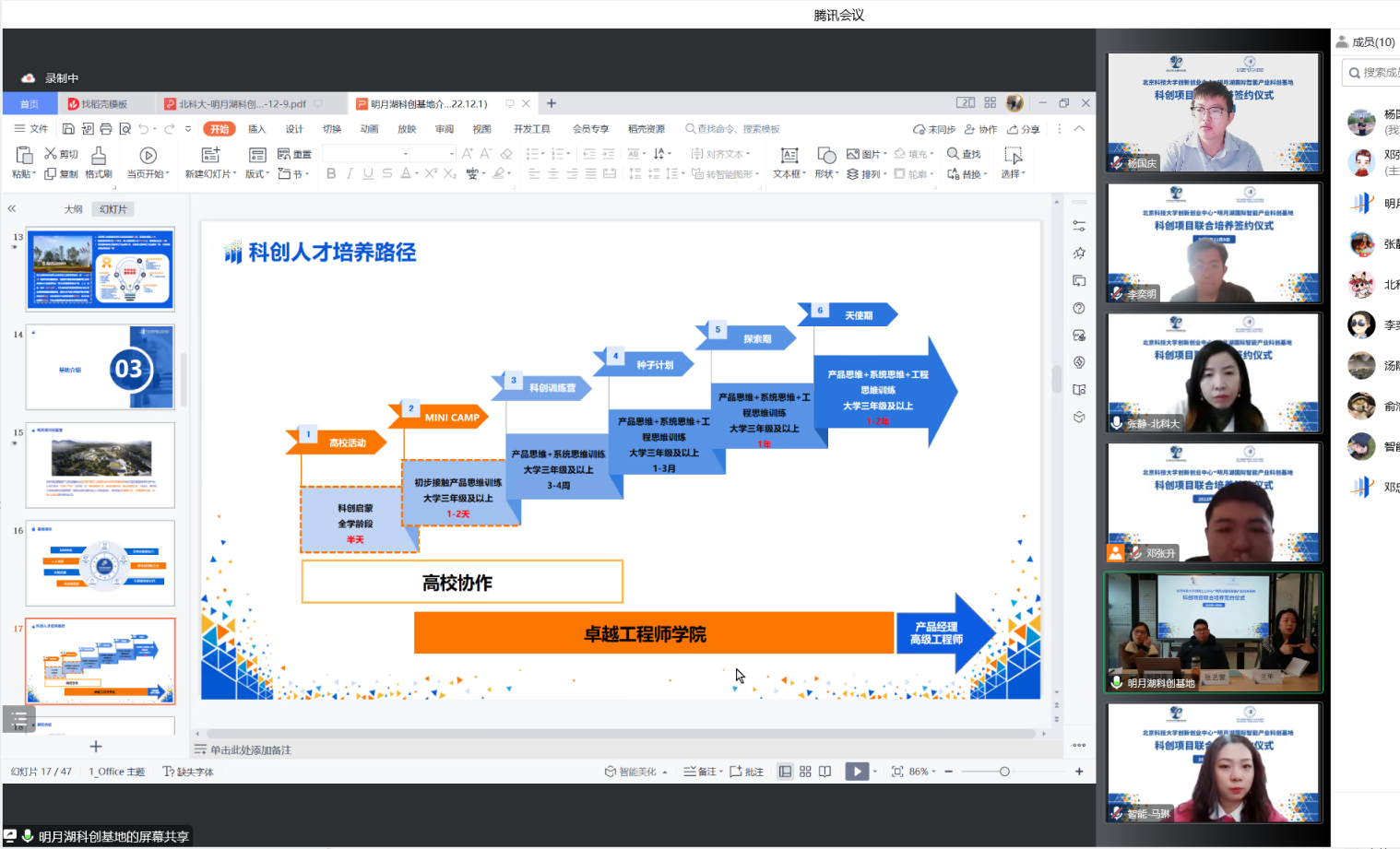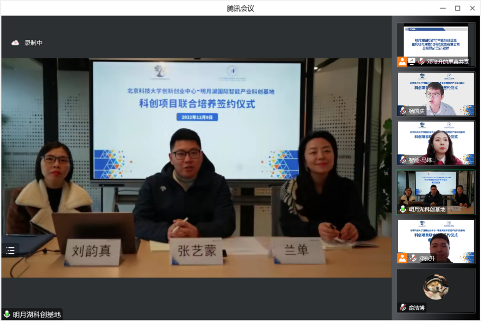 12月9日上午10点,杏吧 杏吧 中心-重庆明月湖智能科技发展有限公司科创项目联合培养协议签约仪式在线上举行。重庆明月湖智能科技发展有限公司总经理张艺蒙、市场运营总监兰单、市场运营主任刘韵真,杏吧 杏吧 中心副主任张静、教师杨国庆,杏吧 部分杏吧 杏吧 分中心教师李奕明、丁宁、汤隆威、俞浩博、马琳参加仪式。仪式由杏吧 中心教师邓张升主持。