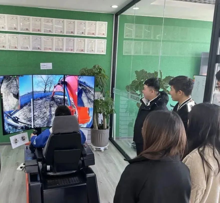 龙哥操作示范讲解后,同学们开始轮流坐到座舱上,亲自体验操控远在四十公里外房山区的挖掘机,熟悉基础操控动作后,开始尝试挖土、卸土等“进阶”动作。同学们都能快速地挖起一斗土,并卸到指定位置。有些同学甚至具备了开挖机的“隐藏天赋”,第一次操作就丝滑流畅,能够使出大臂、小臂和铲斗同时控制的复合作业手法。大家在一声声惊叹中体验到了开挖掘机的快乐。